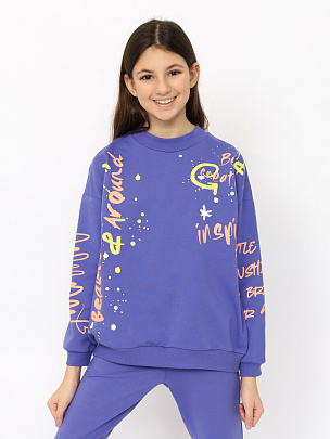 Джемпер с длинными рукавами, притачным поясом и манжетами. Манжеты и пояс выполнены из основного полотна. Горловина круглая с притачным воротником из полотна с добавлением лайкры. Перед и рукав декорированы принтом "Нарушай правила, будущее пренадлежит любознательным, юный и безбашенный, давай будем легендарными".