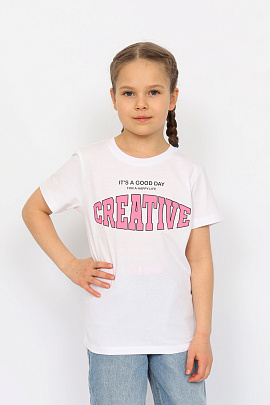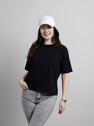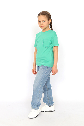 Футболка со спущенным плечом и короткими рукавами. Спереди карман декорирован ришелье. Горловина круглая, обработана притачной бейкой. По ростку горловины шов притачивания закрыт долевиком.