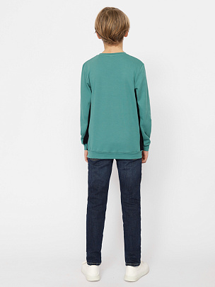 Джемпер для мальчика с контрастными вставками вдоль боковых швов и по рукавам. Рукава с манжетами по низу. Горловина круглая, обработана узким воротником из полотна с эластаном. Перед джемпера декорирован принтом.