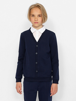 Джемпер с длинным втачным рукавом. Воротник с вырезом и имитацией футболки, по краю ланки воротника расположены декоративные пуговицы.