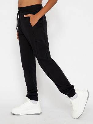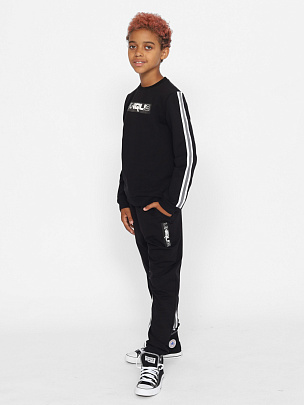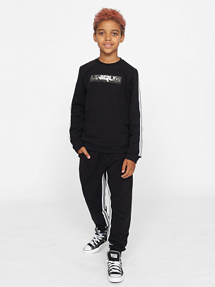 Джемпер с длинным втачным рукавом. Низ изделия и рукава обработаны поясом и манжетами из полотна с эластаном. Рукава декорированы вязаными лампасами. Перед декорирован принтом с эффектом "Высокая база" "УНИКАЛЬНЫЙ". Брюки с притачным поясом и манжетами. В пояс вставлена резинка и функциональный шнур. Пояс и манжеты выполнены из полотна с эластаном. На передней части брюк расположены карманы с подрезным бочком. Шаговые швы декорированы вязаным лампасом. Передняя половинка брюк декорирована принтом с эффектом "Высокая база" "УНИКАЛЬНЫЙ".