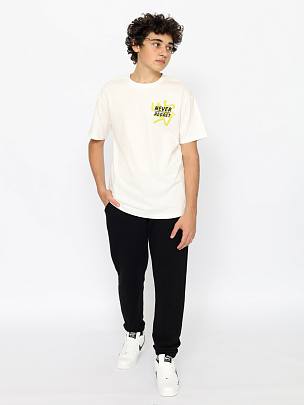 OVERSIZE футболка для девочки с короткими рукавами и удлиненной спинкой.В нижней части боковых швов обработаны разрезы. Перед футболки декорированы принтом.