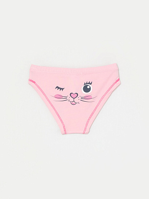 Трусы из гладкокрашенного полотна. Верх трусов и проймы ножек обработаны плоским швом вподгибку. По верху одновременно проложена резинка. Проймы ножек оформлены декоративной строчкой с застилом яркого цвета. На задней половинке выполнена шелкография.