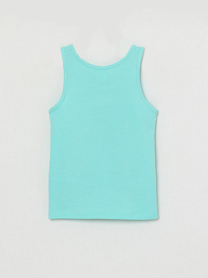Майка с плечом из гладкокрашенного полотна. Горловина и проймы окантованы бейкой. Перед оформлен шелкографией.
