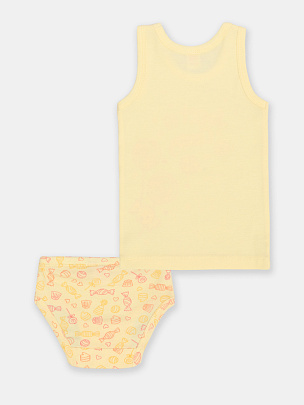 Комплект из гладкокрашенной майки и набивных трусов. Майка с плечом. Горловина и проймы обработаны окантовкой из основного полотна. Перед оформлен шелкографией. Верх трусов обработан плоским швом вподгибку с одновременным прокладыванием резинки. Проймы ножек обработаны окантовкой из основного полотна.