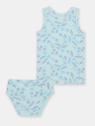 Комплект из набивного полотна. Майка с плечом. Горловина и проймы обработаны окантовкой из основного полотна. Верх трусов обработан плоским швом вподгибку с одновременным прокладыванием резинки. Проймы ножек обработаны окантовкой из основного полотна.