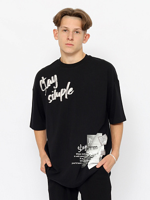 Молодежная футболка oversize с короткими рукавами и выразительным принтом спереди "оставайся простым", "оставайся верным". Футболка выполнена из кулирки повышенной плотности. Горловина круглая, оформлена эластичным воротником.