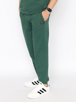 Брюки на манжетах внизу. Отрезной пояс выполнен из основного полотна. В поясе функциональный кругловязаный шнур вставлен в петли. Карманы наклонные в боковых швах. Декорированы жаккардовой этикеткой.