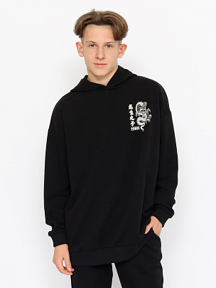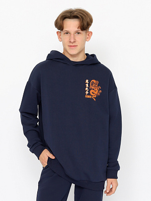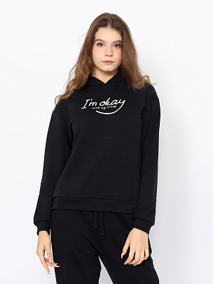 Толстовка для девушки с капюшоном и длинными рукавами из плотного трикотажа без начеса. Рукава с манжетами по низу. Притачной пояс и манжеты выполнены из полотна с эластаном. Перед толстовки декорирован принтом (я в порядке).